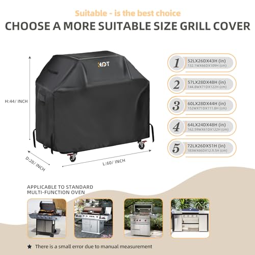 UPGRADE BARBECUE COVER DIMENSIONS: (L x D x H) - 60inch × 28inch × 44inch. KPT bbq grill cover is suitable for most grills with 3 to 5 burners. Fits Weber Spirit, Weber Genesis, Char-broil, Monument, Brinkmann, Dyna-Glo, Nexgrill, Royal Gourmet, MASTER COOK, Megamaster, and other grills. Please measure your grill before ordering.