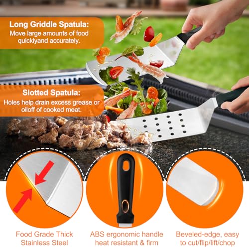[PREMIUM STAINLESS STEEL GRIDDLE ACCESSORIES KIT] Crafted from high-quality stainless steel, our griddle accessories kit for blackstone ensuring non-toxic, rust-resistant, and heat-resistant properties. The extended ABS handles prevent burns during high-temperature cooking, while hanging loops facilitate easy drying and storage. Whether grilling outdoors or cooking at home, our flat top grill accessories are built to withstand high temperatures and heavy-duty use, making cooking task easy