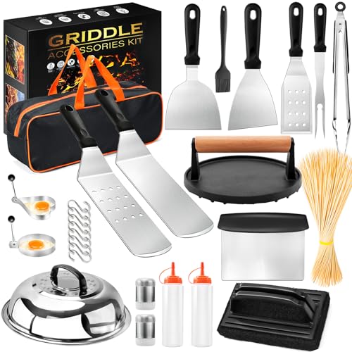 [CHEF'S CHOICE GRIDDLE TOOL SET] Our griddle accessories kit features 5 versatile tools for effortless cooking. Included griddle spatula for flipping, slicing, along with a scraper and chopper for food prep and maintenance. The heavy-duty cast iron burger press is idea for grilling burgers, steaming vegetables, and pressing steaks. Fork and tongs aid in flipping and gripping food, while the cleaning brush removes residue. Egg rings and spice shakers enhance your cooking experience