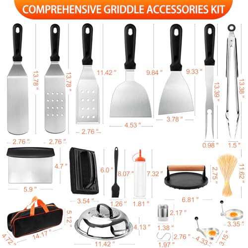 [CONVENIENT STORAGE & EASY CLEANING] Crafted from food-grade stainless steel, all griddle accessories for blackstone are easy to clean and dishwasher safe, ensuring safety and health. This saves you time; however, after washing by hand or dishwasher, make sure to dry them to ensure a longer lifespan. All items are packed in a high-quality storage bag, keeping everything neat and organized. They can be stored together with the flat gril, making them ideal for picnics and camping trips