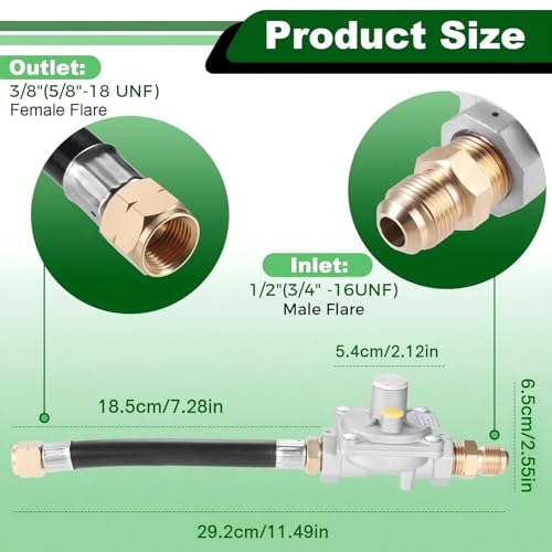 >?Specification?: Inlet adapter is 3/4"1-6 UNF male flare fitting, outlet adapter is 3/8" (5/8"-18 UNF) fitting, outlet adapter to connect the gas stove, grill, pizza to intake channel. Usually 10” W.C. regulator valve with 0.5mm orifice nozzle used from Natural Gas to Propane, 4" W.C. natural gas valve with 2.0mm orifice used from Propane to Natural Gas.