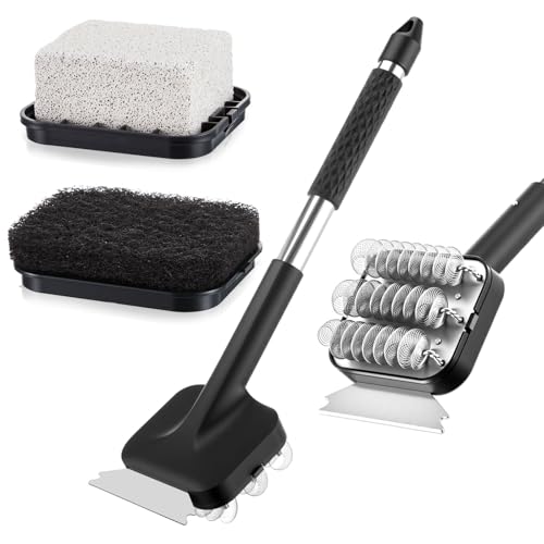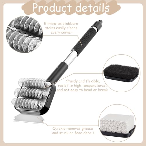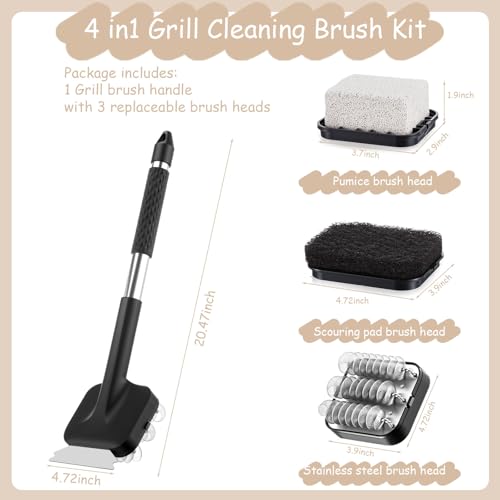 4 In 1 Grill Brush Kit: the newly upgraded grill brush handle features a built in stainless steel scraper that quickly removes grease and stuck on food debris; Equipped with a three row wire brush, pumice stone, and scouring pad replacement head, it eliminates stubborn stains and easily cleans every corner of your grill, provide you with an integrated cleaning solution for your barbecue grill