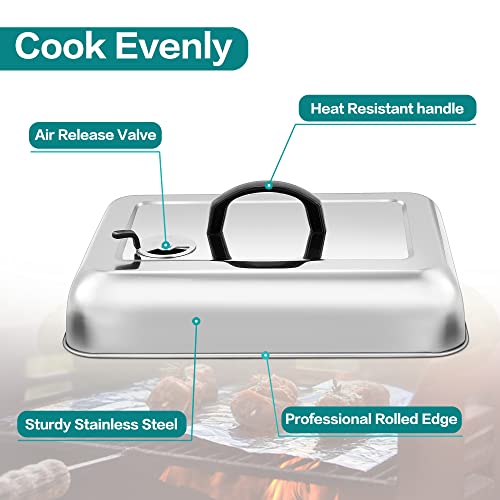 Speed up cooking, round and rectangle basting steam cover allow heat to concentrate under the dome and cook your food more evenly while reducing cooking time and preventing hot oil splashing, 2 different shapes of steam covers satisfy your various cooking needs, meat press presses out the excessive grease or liquid for healthier diet, can help you cook the meat more evenly and even cook faster, spent less time of cooking, great for veggies, steaks, bacon, burgers, pizzas and sandwiches