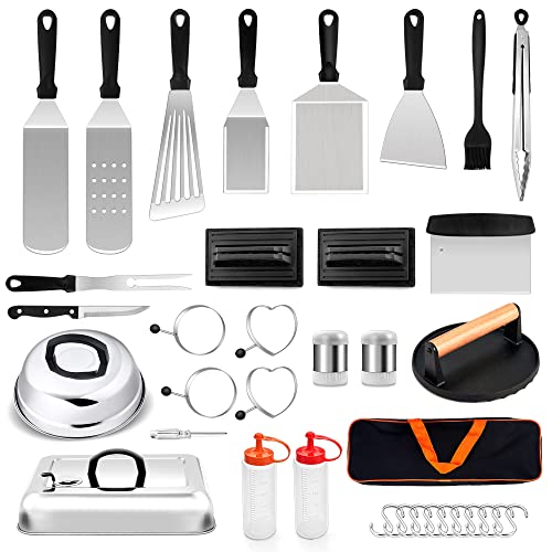 Complete griddle accessories, including 9 inch round basting cover, rectangle melting dome, grill press, hamburger spatula, long metal spatula, perforated spatulas, small spatula, fish turner, grill scraper, chopper, grill tong, basting brush, bbq fork, steak knife, 2 pepper pots, 2 squeeze bottles, 4 egg rings, 2 cleaning brush, 10 S shaped hanging hooks, screwdriver and carrying bag