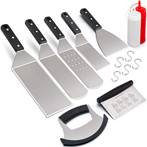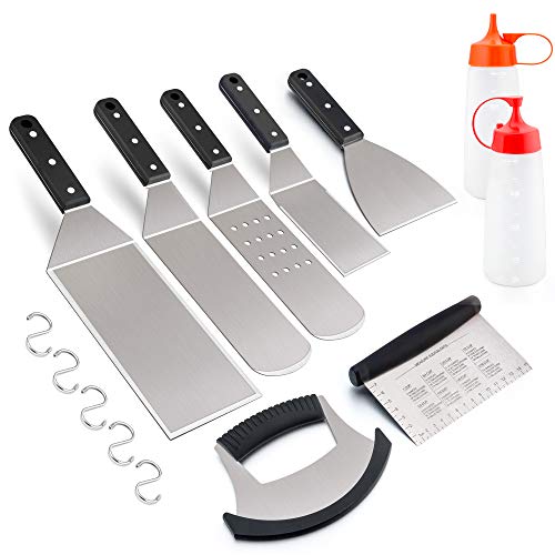 ? INCLUDED - 1 x griddle spatula, 1 x long grill spatula, 1 x perforated grill spatula, 1 x oversized hamburger turner, 1 x small cooking spatula, 1 x scraper chopper, 1 x pizza cutter, 2 x squirt bottles, 5 x "S" shape hanging hooks