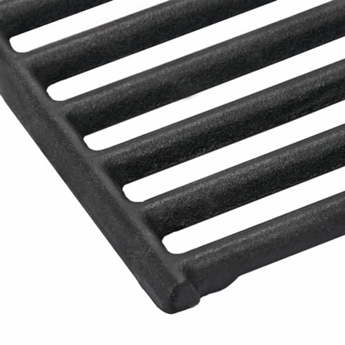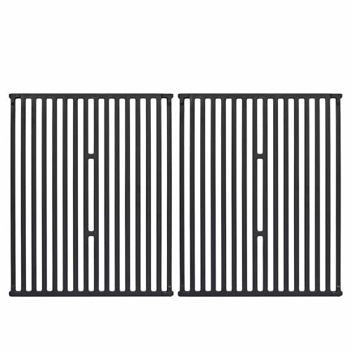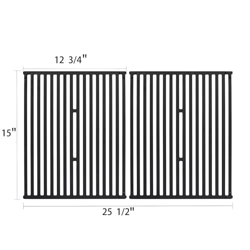 Dimensions: 15" x 12-3/4" for each, 15" x 25-1/2" for 2 pcs. Package: Set of 2 cast iron cooking grates, heavy duty and long lasting. Produce prominent sear marks and retains heat superbly