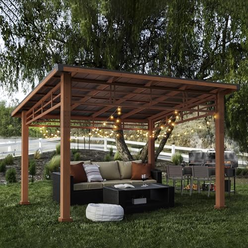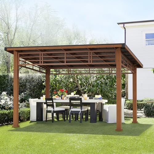 LUE BONA 12x14 Hardtop Gazebo, Outdoor Pergola Metal Roof Gazebo with Wooden Frame, Patio Gazebo Canopy with Curtains, Permanent Pavilion Grill Gazebo for Deck, Patio, Backyard, Garden