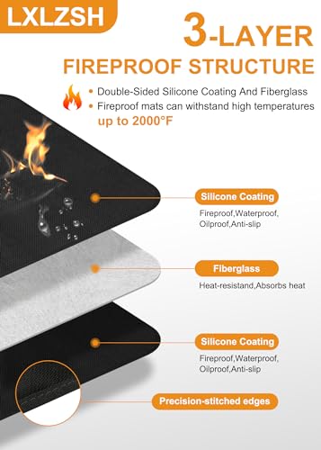 LXLZSH Under Grill Mat:Large size fireproof mat 48*65 inches,0.6mm thickness,can be securely fastened under the grill,can also be used as a fireplace mat and fire pit mat,protects your deck,patio,or garage floor from stains and damages,prevents sparks and grease splatters,easy to clean,make outdoor grilling a breeze!