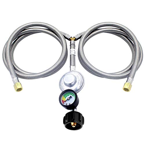????The new upgraded version of the low-pressure Stainless Braided propane regulator hose with a Gauge Level Indicator can use two propane devices at the same time, and can find detect dangerous leaks and read fuel level at a glance.No need to install any additional fuel gauge.