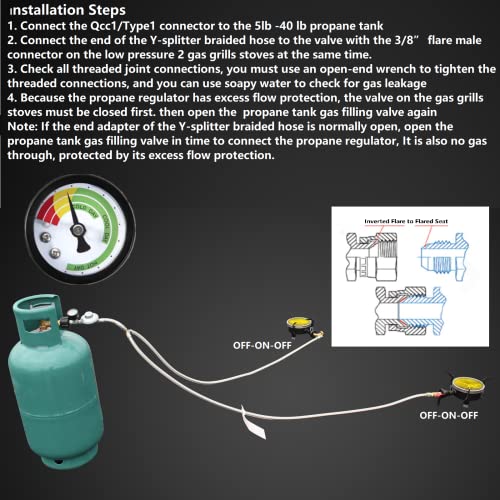 ???? Inlet is QCC1/type1 tank connector with tank gauge level,y-splitter stainless braided hose end fitting connector is 3/8" female flare swivel NUT; QCC1 easy connects to a 5-40lb gas tank and end fitting 3/8" Female Flare Nut can hook up to dual burner camping stoves, gas grills, patio heaters, fire pit tables, LP generators, lanterns, and more has ?3/8" male flare connection ?gas appliance