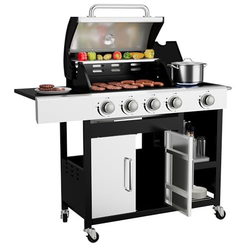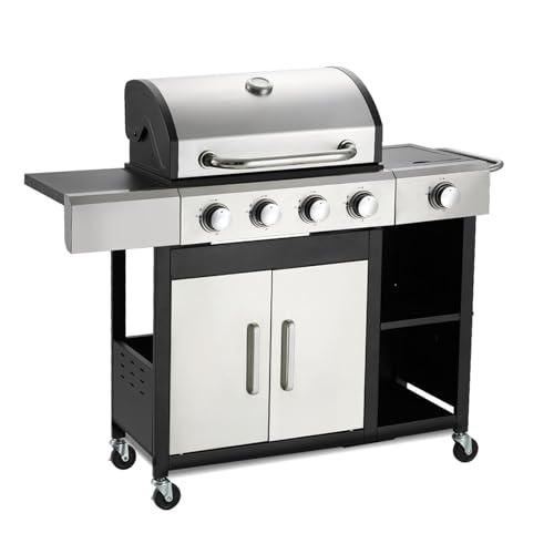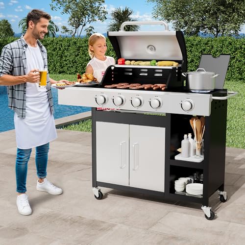 ?Enhanced Side Cabinet & Spacious Cooking Area?With large cooking space, this 4 burner propane barbecue grill is perfect for hosting parties. The added extra side cabinet and bottom room provide extra storage for grilling tools, seasonings, and a propane tank, keeping your outdoor kitchen organized and efficient.