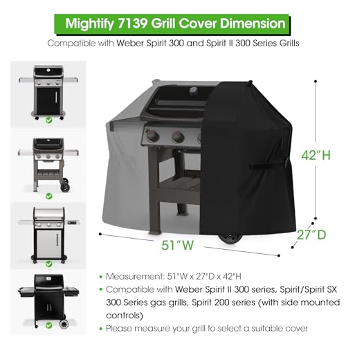?51 Inch Outdoor Grill Cover Dimension: This cover measures 51"W x 27"D x 42"H, compatible with Weber 7139 gas grill cover, Spirit II 300 Series E310, E315, E330, Spirit SX 300 series S310, S315, S330, Spirit II 210 series gas grills with 2-Burner (with side mounted controls). Also fits most 2 to 3-burner outdoor grills of popular grill brands such as compatible with Charbroil, Nexgrill, Kenmore, and more. Please measure your grill before purchasing