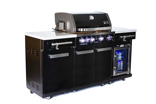 Mont Alpi MA-957FCNG 32-inch 5-Burner 63000 BTU Black Stainless Steel Outdoor Kitchen Island with Refrigerator + Natural Gas Conversion Kit + Grill Cover + Rotisserie Kit + Granite Countertops