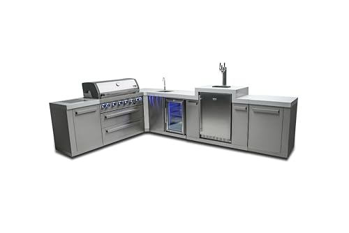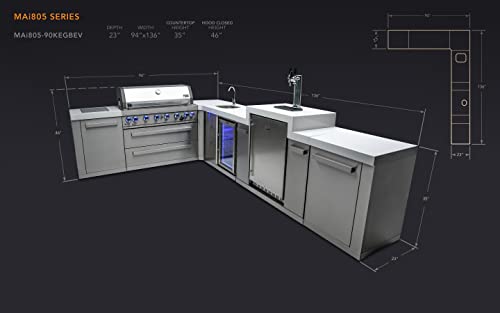 ISLAND FEATURES - The MAi805-90KEGBEV 44-inch island gas grill arrives fully assembled (modular attachment required) and features 6 tubular stainless steel high efficiency burners with a rear height-adjustable ceramic infrared rear burner and a standalone side burner that produce 115,000 BTU’s of heat output. The grill also features a stainless steel warming rack, 8mm stainless steel cooking grids and a generous cooking area of 38-inches x 18-inches (990 square Inches of total cooking area).