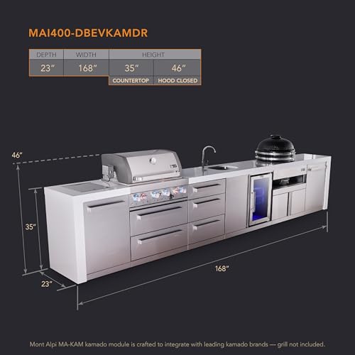 KAMADO MODULE FEATURES - As with all Mont Alpi outdoor kitchen models, this module is made of heavy duty 304 stainless steel and has white granite countertops to match your Mont Alpi setup. The unit comes standard storage cabinets and white granite countertops. (Kamado grill not included).