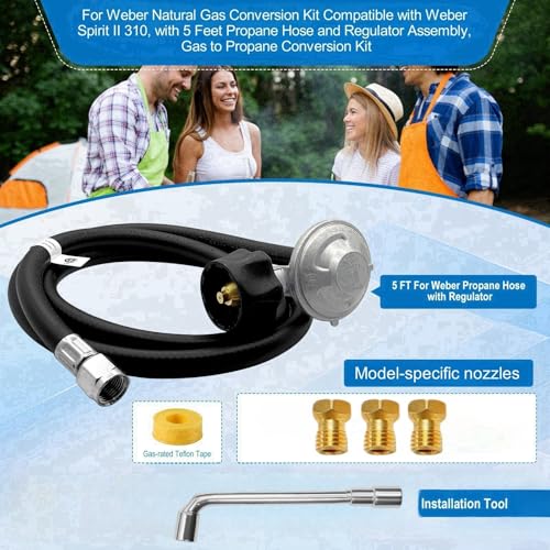 Gas Conversion Kit for Weber: Make the switch from natural gas to propane hassle-free with our gas conversion kit for weber spirit II 310. for weber natural gas conversion kit includes a 5ft hose a with regulator , specialized LP orifices, a socket wrench, and gas-rated Teflon tape—everything you need for a smooth, reliable conversion. Designed to enhance airflow and boost grilling performance, it’s the perfect solution for better grilling, easier setup, more delicious meals!