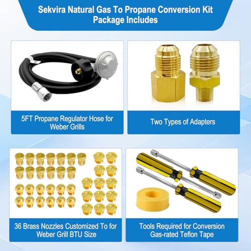 For Weber Natural Gas Conversion kit Get Better Grilling Results with The Right for Weber Conversion Kit:Easily convert your for Weber Genesis,Genesis II,Summit 420,450,460,470,620,650,660,670 grill from natural gas to propane!Sekvira Natural Gas to Propane Conversion Kit includes a 5ft propane regulator hose same as OEM,36 hand-drilled LP orifices (10 sizes),2 types of 3/8" fittings,wrench,sealing tape.Choose the right from NG to LP Gas Conversion Kit for smooth gas flow and better performance!