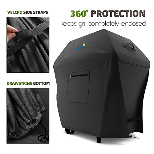 CUSTOMIZED FIT: A drawstring around the bottom, plus a velcro buckle on the side, allow you to cinch the cover tightly around the grill for a secure fit that won’t blow away in gusty weather.
