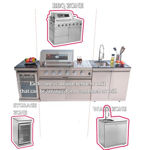 PREMIUM OUTDOOR COOKING EXPERIENCE – The Alimtois 98.4-Inch Modular Outdoor Kitchen delivers professional-grade performance with 4 high-efficiency stainless steel burners and a ceramic infrared rear burner, generating 72,000 BTU of heat for flawless grilling. Featuring an expansive 990 sq. in. cooking area (29”x18”) with 8mm stainless steel grids and a warming rack, this BBQ Island Outdoor Kitchen handles everything from steaks to rotisserie meals with ease. The marine-grade 304 stainless steel construction ensures durability against rust and weather, making it a long-lasting centerpiece for your backyard.