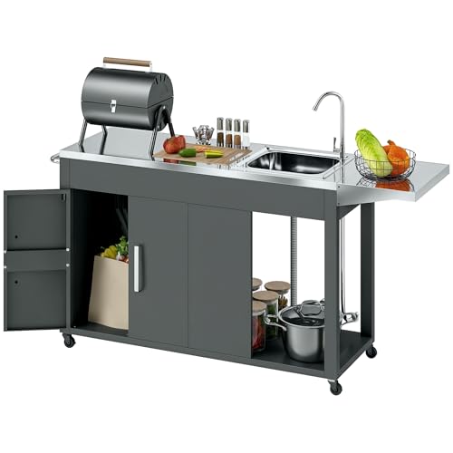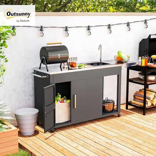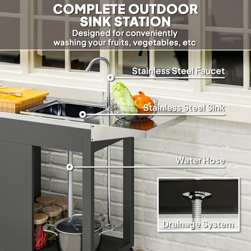 Complete Outdoor Sink Station: This easy-to-clean and robust steel BBQ cart features a complete sink station with a stainless steel faucet with 1/2 in connector and a drainage system designed for conveniently washing your fruits, vegetables, etc