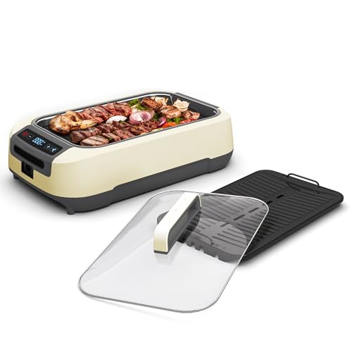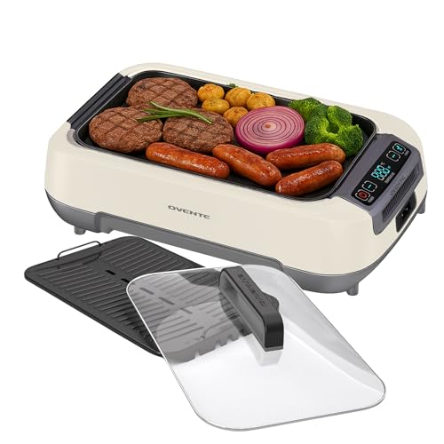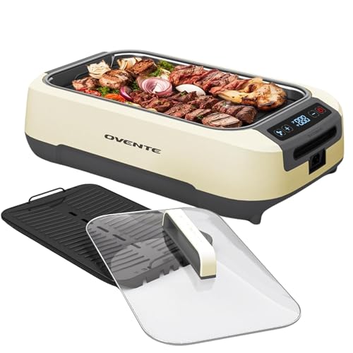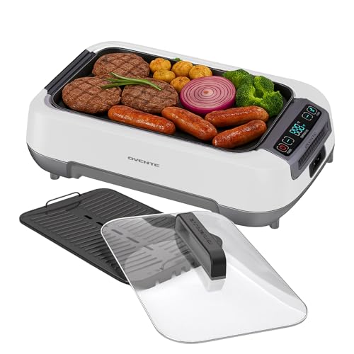 OVENTE Smokeless Indoor Grill, 1500W Electric Portable Korean BBQ Grill with One-Touch Control, LED Smart Display, Tempered Glass Lid, Two Removable Non-Stick and Dishwasher Safe Plates, White SGR85W