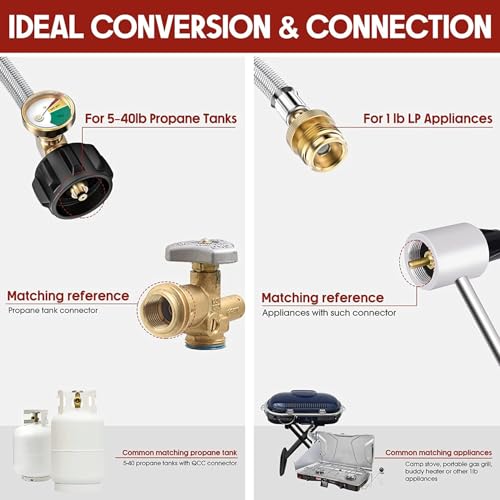 EASY INSTALLATION & MONEY SAVER - Acting as a perfect propane adapter 1lb to 20lb, the PatioGem stainless-steel propane hose extension can connect your lp appliances to 5-40lb propane tanks(of OPD valve only) in a blink, saving your money on 1lb propane tanks.