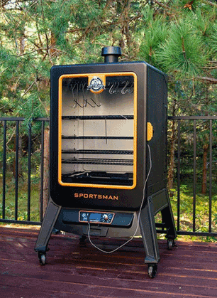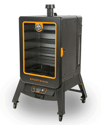 Pit Boss Sportsman 5-Series Wood Pellet Vertical Smoker is a vertical smoker that can cook up to 50 pounds of meat at once. It has an 870 sq. in. cooking area and has a 6" x 2" chrome plated steel tube burner that can burn up to 30,000 BTUs per hour. The hopper holds up to 25 pounds of pellets and it has a removable firebox that makes adding more wood easier than ever before.