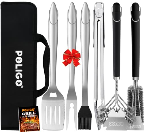 Essential Grill Tools Set: The bbq set comes with grill fork, barbecue spatula, grill tongs, basting brush?convenient storage bag, wire grill brush with scraper and non bristle grill brush with scraper.