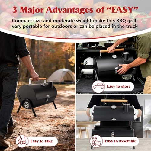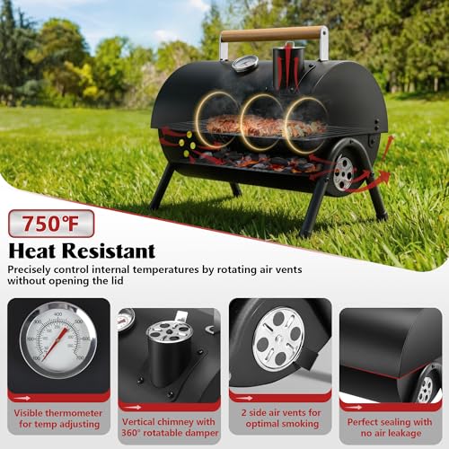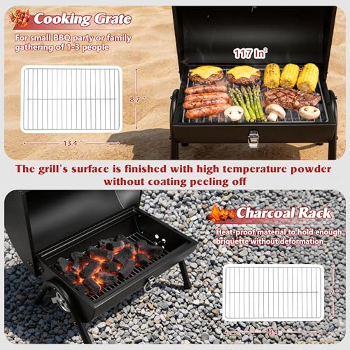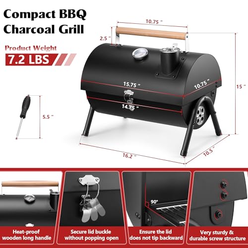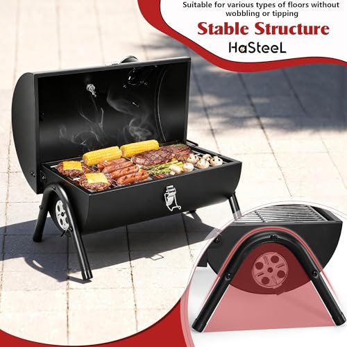Portable Charcoal Grill with Thermometer, HaSteeL Small Tabletop Barbecue Grill Smoker for Outdoor Camping Backyard Beach BBQ, 117 Square Inches Cooking Area, Thick Steel, Screwdriver, Black