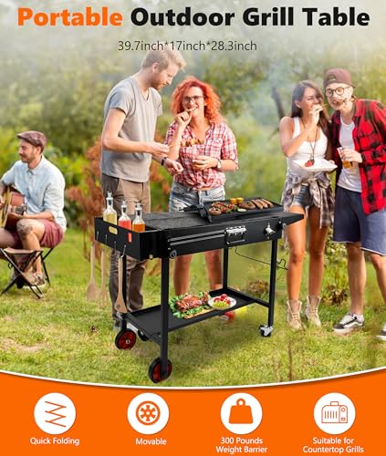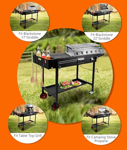 SUITABLE FOR COUNTERTOP GRILLS?This is the best-in-class grill cart for Blackstone 17"/22" grills, Blackstone grill pans, grills, Ernie's pizza ovens, tabletop grills, camping stoves, and other countertop grills up to a maximum of 31" Wide X 17" (front and back) in size. Suitable for outdoor/indoor removable food carts, the grilling companion for tailgating, camping, and parties.