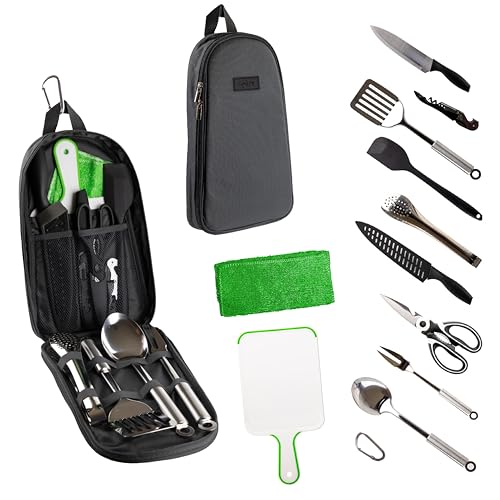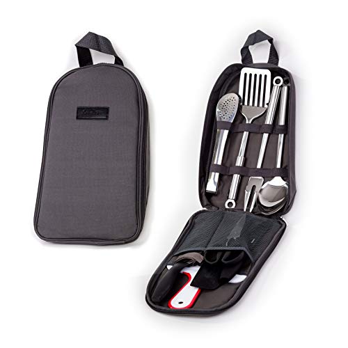 A MINI KITCHEN ON THE GO- Our portable utensil organizer fits all the essential kitchenware for the comfiest outdoors dining experience: Spatula, Serving Spoon, Serving Fork, Chef Knife with Sheath, Paring Knife and Peeler Combo, Silicone Spatula, Scissors with bottle opener, Tongs & Cutting Board- Plus, the bag has additional space so you can personalize your kit.