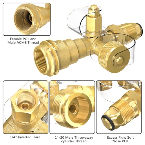 ??4 Port Propane Brass Tee?Female POL (Male ACME Thread) x Excess Flow Soft Nose POL x 1"-20 Male Throwaway Cylinder Thread x 1/4" Female Inverted Flare. 4 port propane brass tee install between the supply and regulator on a motorhome or RV. Make your onboard propane tank more versatile and convenient for multiple uses. Add versatility to your onboard propane. Note: Please tighten the connection by wrench when install, or it may occur gas leakage during use.