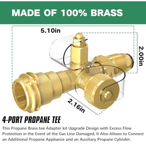 ??Upgraded Stainless Braided Hose Propane Brass Tee Adapter Kit?Upgrade the 5' auxiliary tank hose and 12' additional appliance hose to Stainless Braided Hose. This Propane brass tee adapter kit upgrade design with excess flow protection in the event of the gas line damaged, it also allows to connect an additional propane appliance and an auxiliary propane cylinder. Great for camping, BBQ, tailgating, outdoor cooking, grill, stoves, heater, propane appliance. A must have if you are a RVer.