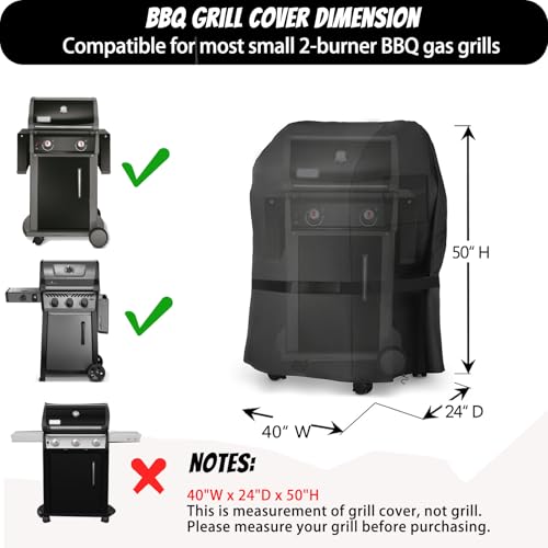 ?Grill Cover Dimension?This grill cover measured 40"W x 24"D x 50"H, compatible for most small 2-burner BBQ gas grills. Be sure to measure your grill size before purchasing and choose a cover with space to spare.