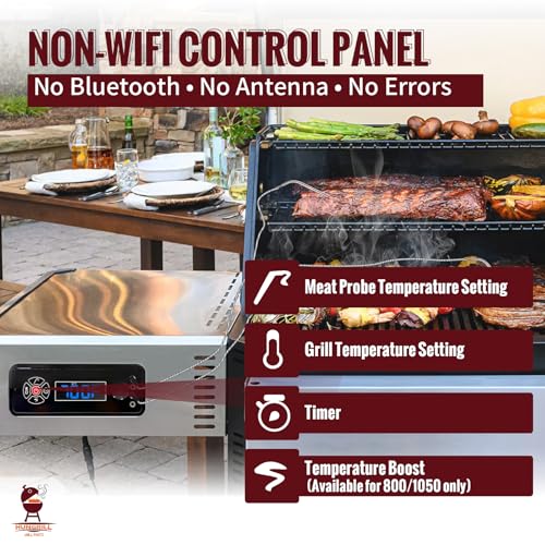 DIGITAL TEMPERATURE CONTROL: Set desired grill/smoker temps with the digital panel. Features Boost Mode (for 800 & 1050 models only), timer, and dual temp monitoring (grill + meat probes).