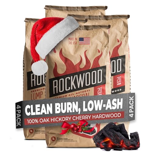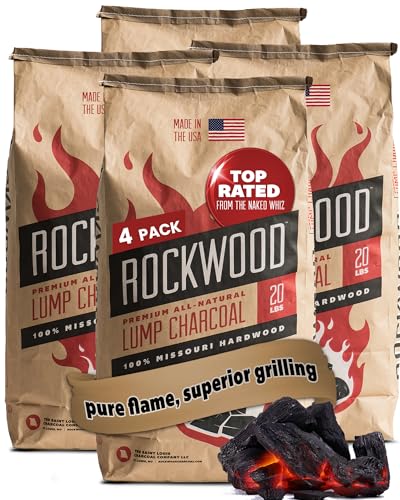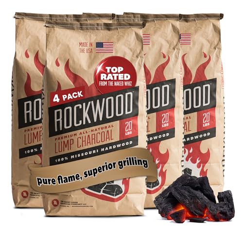 Rockwood Natural Lump Charcoal – Premium Oak, Hickory & Cherry Hardwood Blend for High-Heat Grilling & Slow Smoking – Compatible with Kettle & Kamado Grills, Clean Burning, Made in USA – 20lbs (4pk)