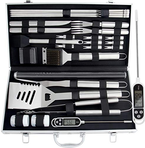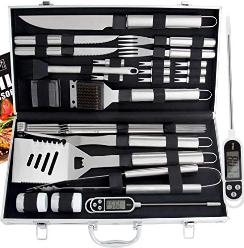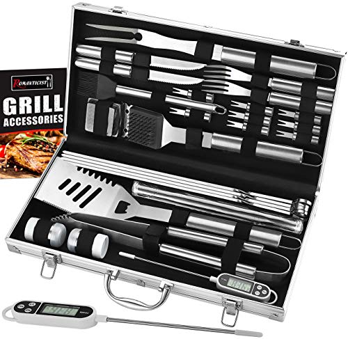 ROMANTICIST 27pc BBQ Grill Accessories Set with Thermometer in Gift Box for Men Women - Heavy Duty Stainless Steel Grill Utensils with Aluminium Case for Outdoor Camping Backyard Barbecue