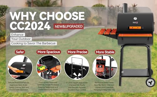 Adjustable Charcoal Pan: The 3-level height-adjustable charcoal pan ensures better heat control and holds up to 4.4 lb. of coal. It efficiently collects ashes for hassle-free cleanup – just remove it for easy dumping after cooking and cooling