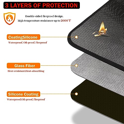 ? Fireproof & Heat Resistant Grill Mat: Grill mat for outdoor grill is with 3 Layer design, made of fiberglass, heat resistant silicone resin coated on both sides, which can provide heat resistance up to 2000?. Our heat resistant mats have finely stitched edge banding design. It won't stick, tear, curl or crack from heat. Preventing falling hot embers and hot grease from damaging decks and lawns.