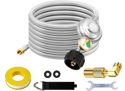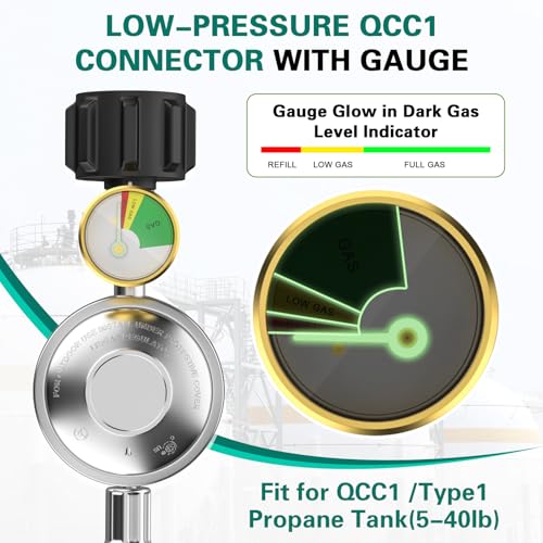 2025 UPGRADED 12 FEET STAINLESS BRAIDED LOW PRESSURE PROPANE REGULATOR HOSE WITH GAUGE:This improved low pressure propane regulator hose upgrade to wrap with stainless steel braided for longer life. Low Pressure Propane Regulator Hose with Gauge with 3 different colors Dial Gauge can glows in dark. Gas level indicatorto help you read and monitor the gas levels clearly any time, also can detect the leaks. Allows you to switch from a 1-pound propane bottle to a 20-pound bulk propane tank
