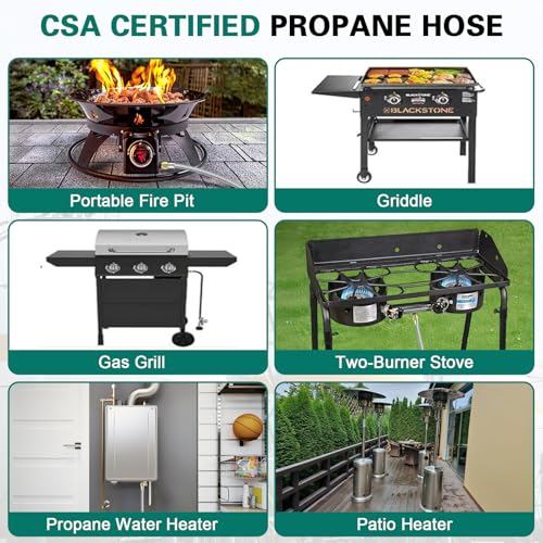 PREMIUM MATERIAL:This propane regulator and hose fittings, gauge and 90 degree propane elbow adapter are made of 100% Solid Brass to ensure secure, durable for long service time. 12 Feet Propane Adapter Hose is made of durable stainless steel braided with weather resistance, anti-corrosion, anti-aging, air tightness, heat-resistance, flexibility features. This Propane Regulator Hose with Propane Tank Gauge with CSA Certification ensure security, air tightness and stability