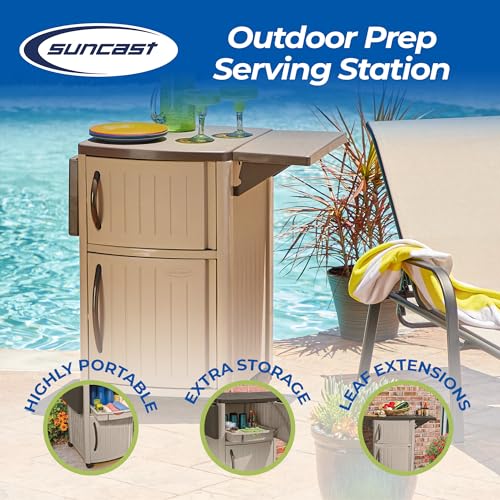 Suncast DCP2000 Portable Outdoor Patio Backyard Grilling Entertainment Serving Prep Station Table with Cabinet Storage and Drop Leaf Extensions, Beige