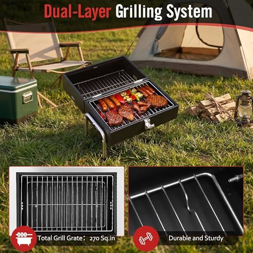 SUNLIFER Portable Charcoal Grill, Table Top Small BBQ Grill For Outdoor, Camping, Beach, Easy Assembly, Heavy Duty & Multi-Use Small Grill, Black (270 Sq.In)