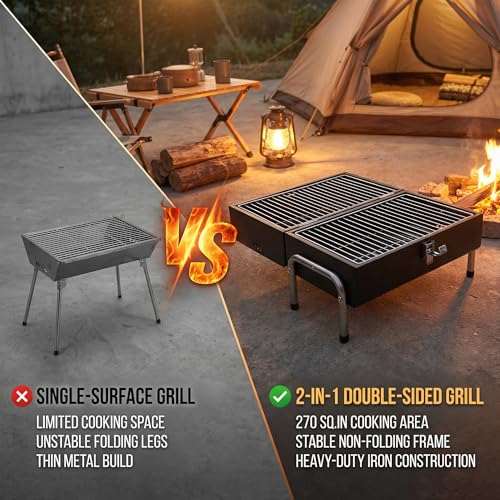 ?2-in-1 Double-Sided Grill?Grill steaks on one side (135 sq.in) and fry veggies on the other (135 sq.in), totaling 270 sq.in. Heavy-duty iron construction ensures durability. Expands into dual surfaces in 10 seconds—no folding needed. Compact for car trunks.