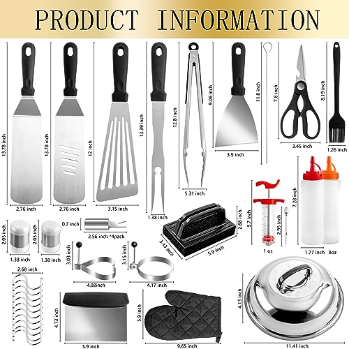 Complete Grill Set: The 45pcs blackstone griddle accessories is a complete set of professional-grade stainless steel BBQ tools that come with heat-resistant handles, non-slip design, and hanging loops for easy storage. The kit is durable, dishwasher safe, and comes in a portable canvas bag.