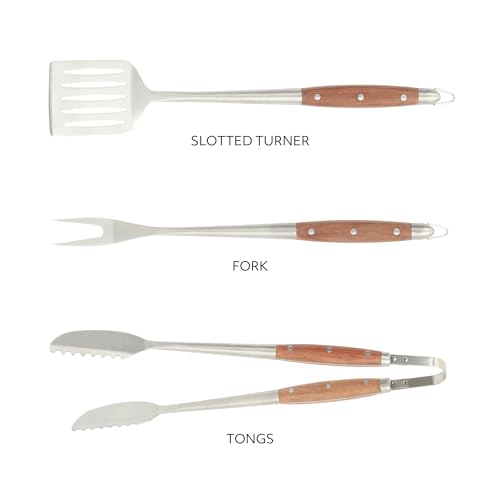 ROSEWOOD HANDLES: Fashioned from rosewood craftsmanship, the riveted handles offer comfort and control for easy scooping, flipping and serving. rosewood is heat-resistant and non-absorbent to help protect the handles from moisture and cracking over time. end loops offer a hanging storage option for each grilling tool.
