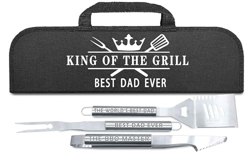 FATHERS DAY GIFTS FOR DAD - This bbq gifts for dad sets, have 3 essential tools for grilling: multi function spatula, durable grill tongs and fork. All these three pairs are uniquely customized with cool saying. And are all contained in a durable & uniquely customized durable cloth carrying case.