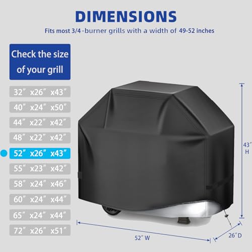 TIAOFY BBQ Gas Grill Cover for Outdoor, Anti-UV, Rip-Proof, 600D Oxford Fade Resistant Material, Barbecue Cover with Hook and Loop Straps & Adjustable Hem Drawstring-10 Size Options(52”x26” x43”)