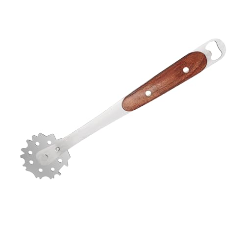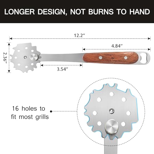 MULTI-PURPOSE SCRAPER: Multi-purpose grill scraper has 16 cleaning grooves - 9 round grooves, 5 V-shaped grooves, and 2 flat grooves, that work with most grills to scrape electric, cast iron, gas charcoal, ceramic-coated grills, etc. The end of the handle is equipped with a bottle opener for hanging storage and opening beer bottle caps.
