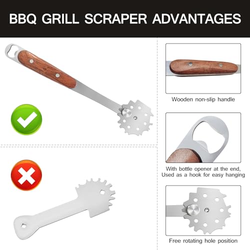SAFE MATERIAL: BBQ grill scraper is made of high quality stainless steel and wooden handle, sturdy and durable. Safer than traditional wire grill brushes, there is no risk of metal copper wires and waste getting into your food.
